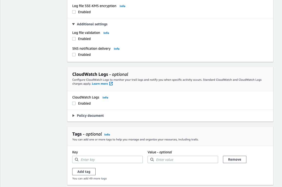 3. I have chosen to untick both the log file SSE KMS Encryption and log file validation. Click Next.