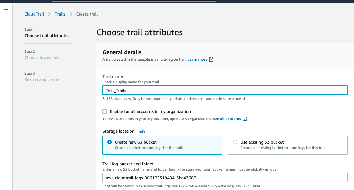 2. Click on the 3 bars at the Top left corner and select trails. Then click on the new trail and enter the name of the trail you wish you give. There is an option to select "Enable for all accounts in my organization" use this if you wish you log the events across your organization in a single place. This can be done only if you create this trail in your management account.